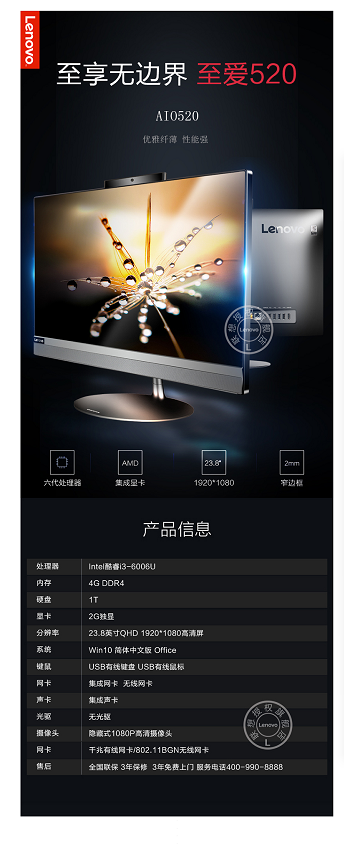 • 商品名称:联想(Lenovo) 一体机电脑 AIO 520-24 23.8英寸家用办公台式电脑:i3/8G/1T+128G 集显银